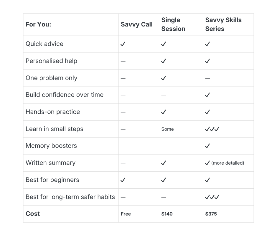 Online safety skills to: spot the scam tricks, protect your information & stay calm & confident